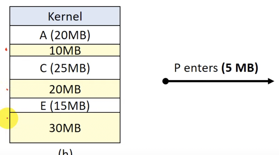 만약 이상황에서 5MB를 필요로하는 프로세스 P가 메모리를 할당받으려고 온다면 어떤 partition에 프로세스 p를 적재할까?