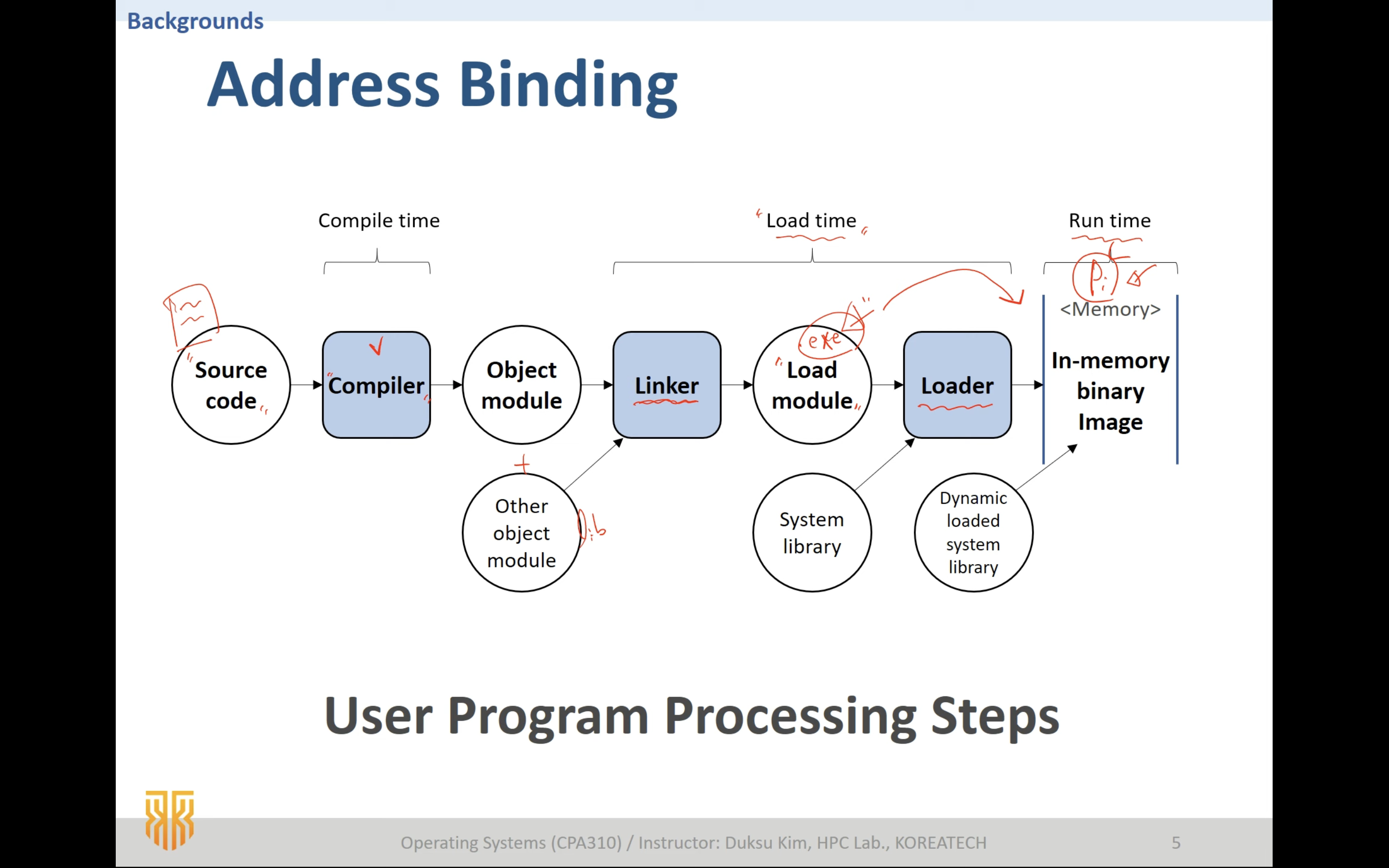 소스코드가 컴파일러에의해 Object module이 될때 즉, 컴파일 될 때 논리주소를 물리주소로 매핑하는 Address Binding이다.