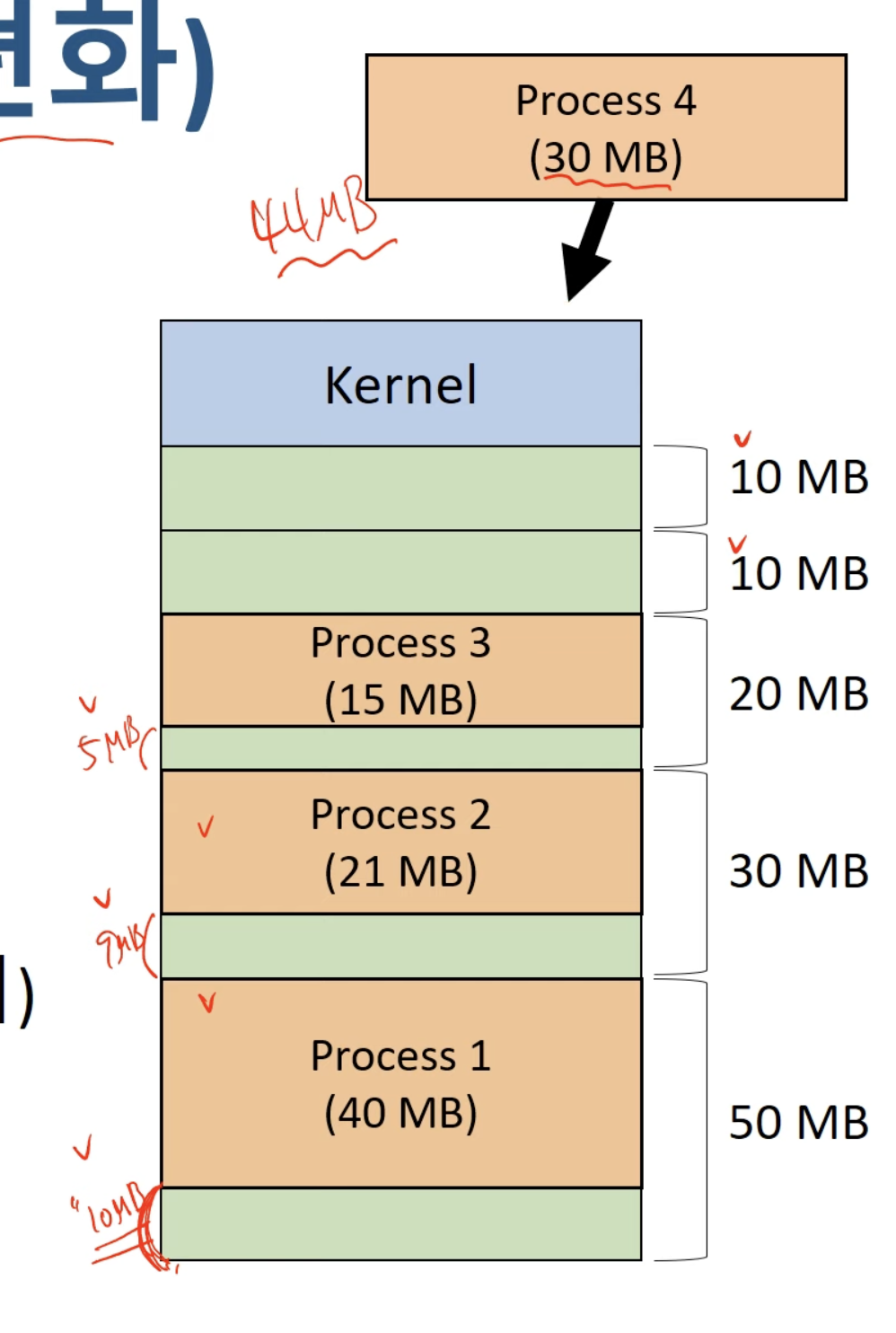 위 그림처럼 Process 4가 메모리에 적재되야하는데 적재될수 있는 partition이 없는걸 볼수 있다.