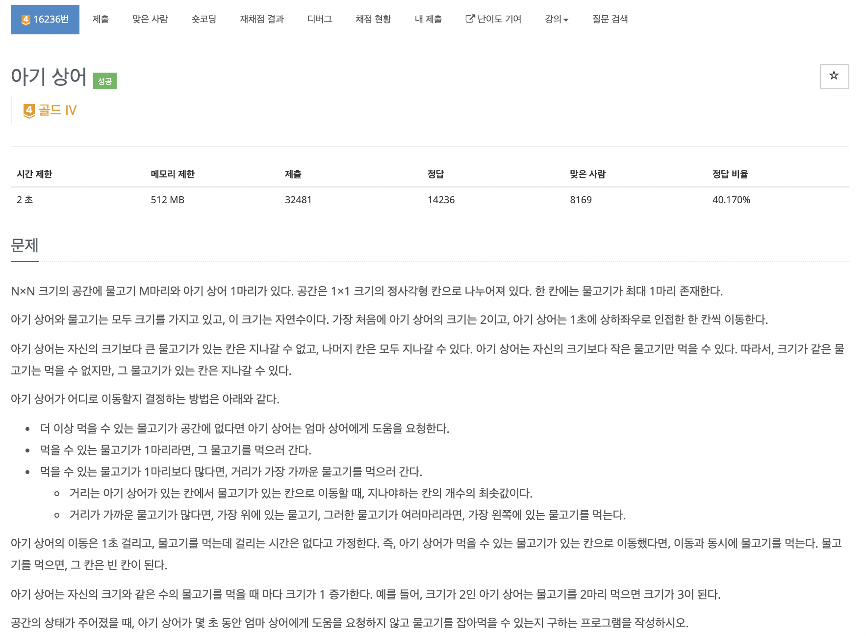 단순 bfs만으로 상하좌우 방문의 순서를 정해준다해서 같은 거리에 가장위쪽, 가장왼쪽의 먹이를 먹는다는 보장이 없다. 이 아이디어를 떠올리지못해 단순 bfs탐색 순서만으로 (위 -> 왼쪽 -> 오른쪽 -> 아래) 고집하여 풀다보니 문제를 푸는데 삼일을 소요했다.