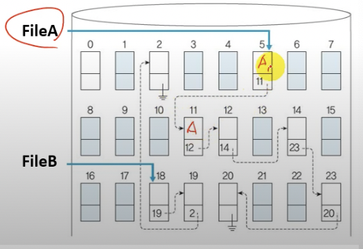 Linked List를 이용해서 파일을 디스크에 저장하는 방법이다.
