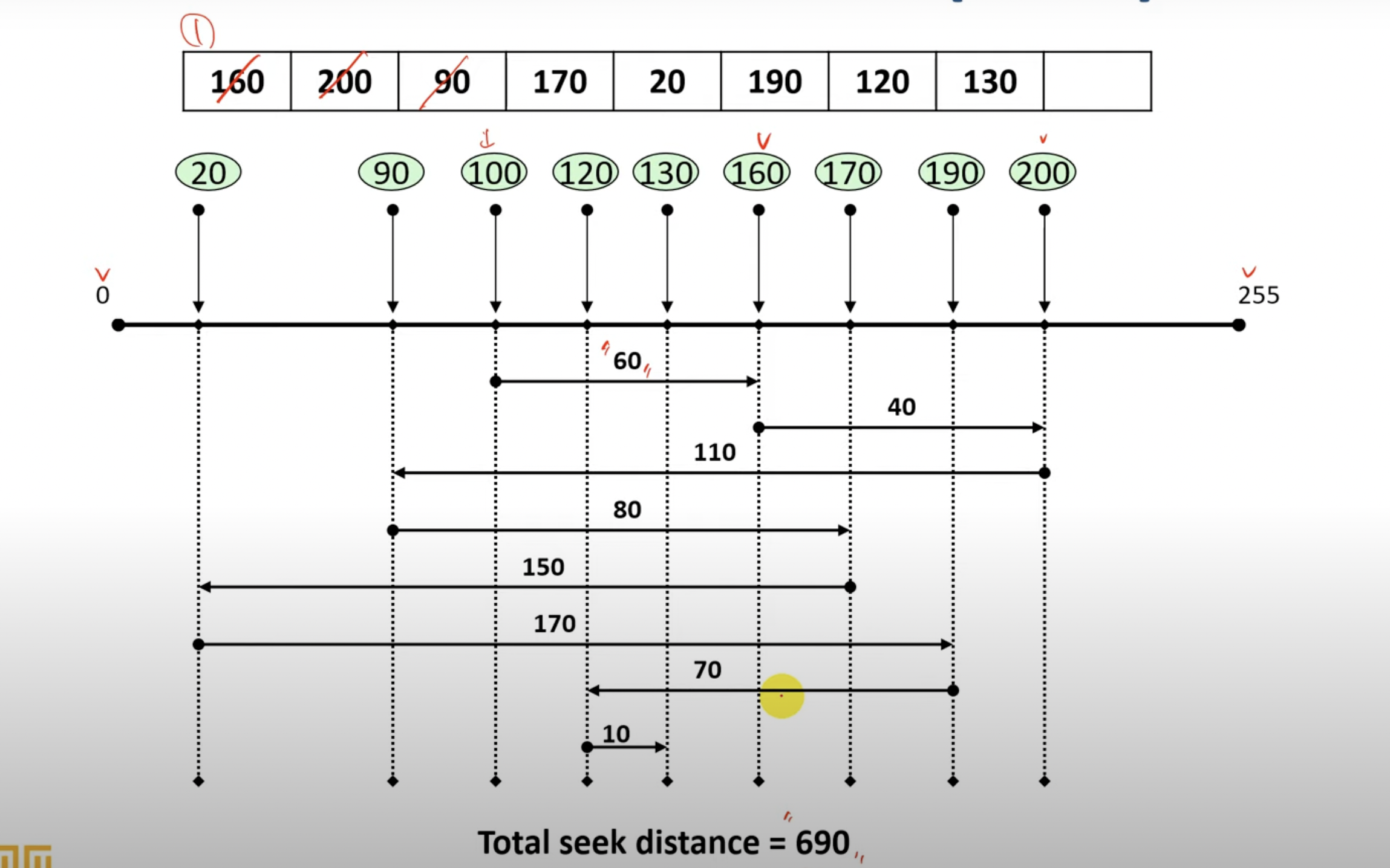 (보면 0까지 헤드가 갔다가 바로 255까지 휙가버리는걸 볼수있다.)