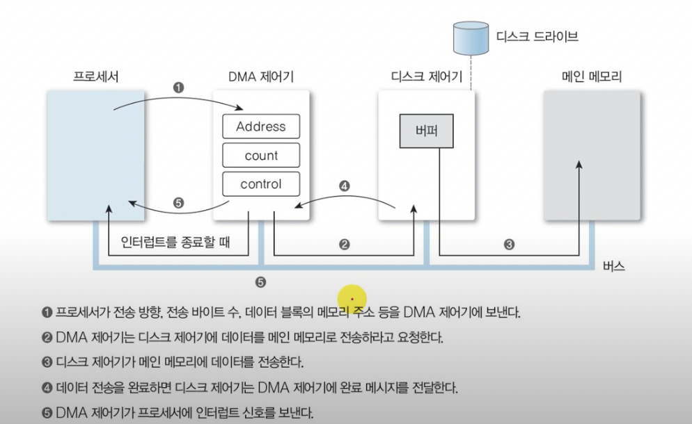 - DMA제어기가 프로세서에 인터럽트 신호를 보낸다.