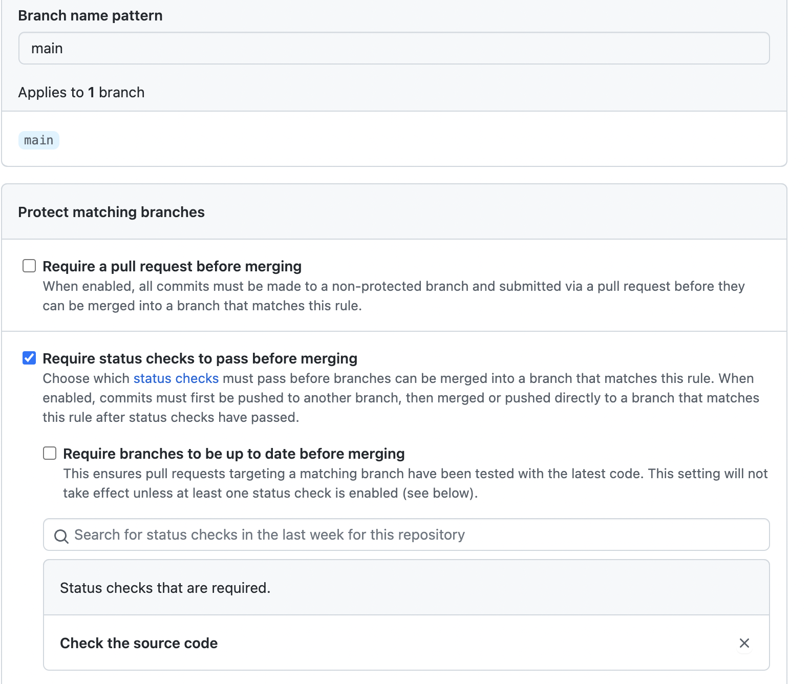 Branch name pattern에 적용할 브랜치 이름(저희는 main이겠쥬?)을 적고