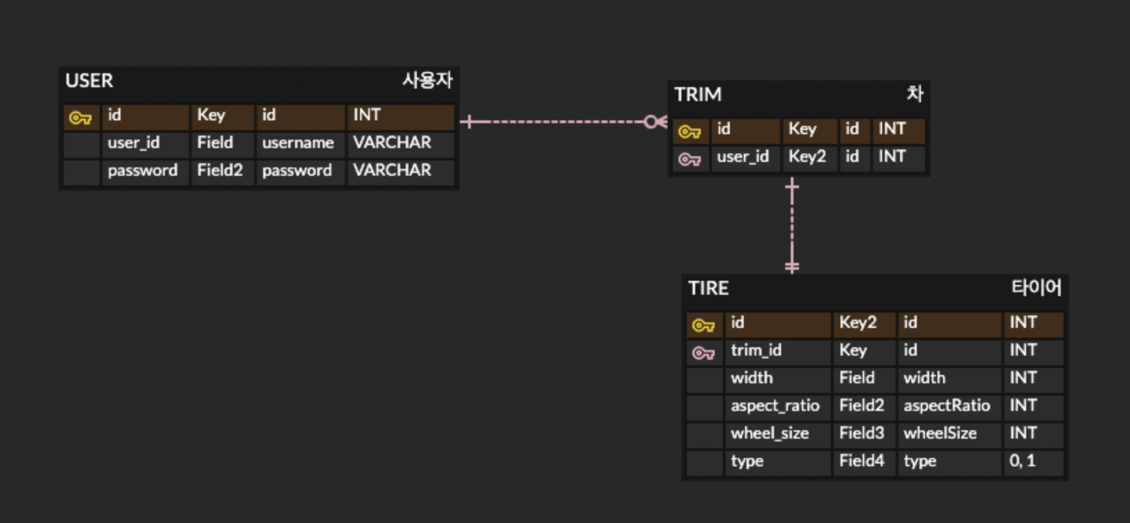 또한, 위처럼 생각한다면 타이어를 조회할시 한 유저가 같은 trimId의 차를 여러개 가지고 있을 수 있다 생각했다. 같은 trimId의 차를 여러개 가지고 있다면 같은 타이어 정보만을 응답할 것이다. 이건 어쩔수 없는 문제라 생각했다. (수정하는 로직은 수정하는 로직에서 따로 만들어야 한다고 생각했다.)